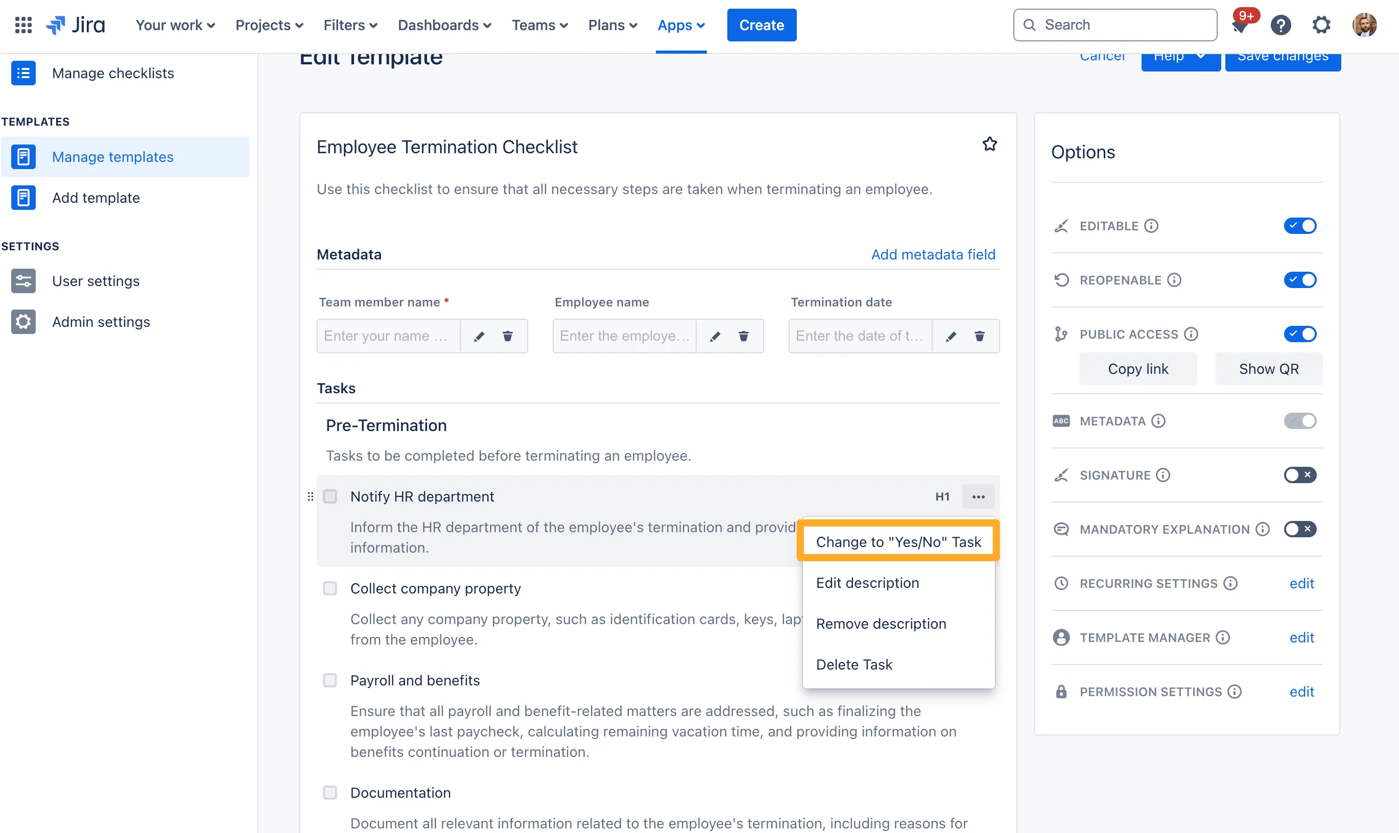 In each checklist template, you can set the task as yes/no using the ”…” menu next to each task.