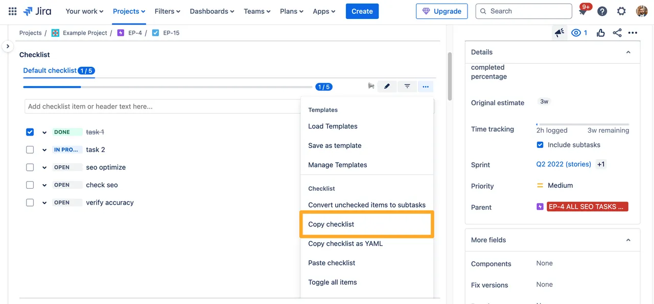Find the the issue where you would like to copy the checklist from and locate the Checklist panel.